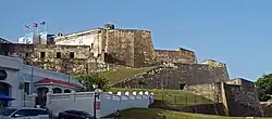 Castillo San Cristóbal (English: Saint Christopher Castle) is a fortress in the Old San Juan historic quarter of San Juan, the capital municipality of Puerto Rico, known for being the largest fortification built by the Spanish in the New World.[5] Dating back to defense expansions following attacks by the English in 1598 and Dutch in 1625, it was first constructed in 1634 as the Caballero de San Miguel (Saint Michael Cavalier) and the Garita del Diablo ("devil’s sentry box").[6] Over the next 150 years, especially in the reign of King Charles III of Spain, it continued to be developed into a bastion fort with outer ravelins and batteries to reach its largest size in 1783.[7] Rising 150 ft from the Atlantic shoreline, the three-level edifice stands on a hill at the northern coastline of San Juan Islet, guarding the land entry to Old San Juan.[8] Alongside El Morro, La Fortaleza, and other forts part of the Walls of Old San Juan, it protected strategically and militarily important Puerto Rico, or La Llave de las Indias (The Key to the Indies),[9] from invasion by competing world powers during the Age of Sail. It was designated a World Heritage Site by UNESCO in 1983.[10]