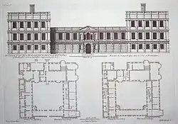 By 1635 an ambitious classicising screen had been added across the open southern side of the courtyard, probably to make the two wings directly accessible to each another; its design deviates enough from Palladian canons to make it unlikely that Inigo Jones designed it;[3] Howard Colvin[4] suggested that a payment of £8 to "Cartor Surveyor" in the Earl's accounts, September 1631, may refer to Edward Carter, Jones's deputy at St. Paul's Cathedral, 1633–41. Work proceeded at Castle Ashby until, as Colen Campbell the architect put it, "the Civil Wars put a stop to all Arts".