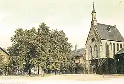 In 1858, another fire broke out, sparing no part of the chapel.[1][7][19] The western span of the building collapsed as a result of the fire.[1][6][7][19] After the fire, a brewery was built, followed by the reconstruction of the chapel (lasting until 1873), overseen by Juliusz Starcke.[1][6][7][19] During the reconstruction works, the interior of the building was modernized, and the western facade of the exterior was redesigned in the Neo-Gothic style.[1][7] Triangular gables were added to the eastern and western elevations. Additionally, the gable of the western facade transitioned into a spire, crowned with a pyramid. Inside the church, space was made for a musical choir loft, supported by two columns.[19] In 1873, a Neo-Gothic wooden altar of St. Thomas Becket, likely crafted by Adalbert Siekinder from Munich, along with a painting of the patron by Jan Bochenek and organs, were installed in the chapel.[3][8][22] A few years later, the interior was enriched with stonework. The three-part windows were adorned with tracery.[22] The consecration of the chapel took place on October 18 of the same year.[22]