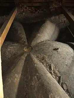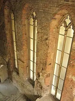 The chapel has a two-story layout, connected by stairs in the wall from the east.[6][8][9][11] The upper level served liturgical purposes.[6][8][9] There is a Neo-Gothic, brick choir supported by two columns.[19][24] The lower level served as either the tomb oratory of Przemysław and his family or as a place for storing holy relics, functioning as a sanctuary.[6][8][9] The first purpose seems unlikely, as after the death of Przemysław, he was buried in the Dominican monastery in Racibórz. The crypt under the chapel has a ribbed vault from the second half of the 17th century supported on two pillars and on chalice-shaped corbels located in the perimeter walls.[11][24] In the western part there is a church porch.[11]