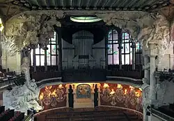 Stage of the Concert Hall of the Palau de la Música Catalana where on January 27, 1919, the mayors and delegates of the Catalan city councils ratified the draft statute of the Commonwealth of Catalonia.