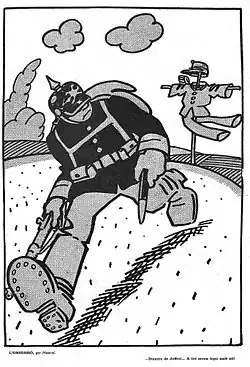 Cartoon from the Catalan satirical magazine L'Esquella de la Torratxa praising Marshal Joffre (1915). The German soldier who flees when he sees the scarecrow with the French uniform says: "Damn Joffre!.... Everywhere I run into him".