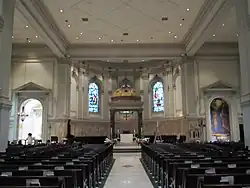 Brooklyn's first bishop, John Loughlin planned a new cathedral dedicated to the patroness of the diocese, the Immaculate Conception and its construction started in 1868 in Fort Greene, at Green Street and Clermont Avenue.[1] The cornerstone for the new cathedral was laid, and the walls built to a height of 10 to 20 feet before construction was stopped due to inadequate funds; of the planned complex, only a chapel (no longer extant) and the Bishop's residence (now LaSalle Hall of Bishop Loughlin Memorial High School) were completed.[4] In 1896, Louglin's successor Bishop McDonnell designated a St. James Cathedral a pro-cathedral, anticipating the completion of Immaculate Conception.[5] Although the current church on the original site was built in 1903, it did not become a cathedral again until 1972.[1] The newly elected Pope John Paul II visited in 1979, and formally designated it as a basilica in 1982.[6][7]