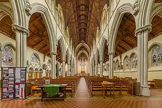 The cathedral was designed in Gothic Revival style by John Crawley in 1877–1881. Crawley died just as building started and his partner Joseph Hansom took over the project and modified the design, working on it until 1896. The church is built of Fareham Red Brick with Portland stone dressings.[3] In 1900, John Cahill succeeded Vertue as Bishop of Portsmouth. Cahill completed the cathedral by adding the west front; the bell towers, designed by Canon Alexander Scoles, were added in 1906.[4] The last new addition to be built was St Patrick's Chapel in 1924 by the Irish-born Bishop Timothy Cotter.[5] The cathedral lacks a spire due to unsuitable ground conditions.[3]
