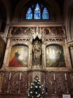 In 1970 a major reordering took place at the instigation of Bishop Derek Worlock, in keeping with his interpretation of The Second Vatican Council. The elaborate baldacchino surmounting the high altar was destroyed and the paintings on the Sanctuary and side chapel walls by Nathaniel Westlake were mostly painted over. A new altar and font were installed and the whole sanctuary was modernised to the designs of the architect Austin Winkley.[4]