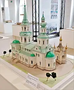 Drawings from 1835 show side colonnades, rustication on the lower floor, and window architraves typical of Moscow Baroque. By 1854, the lower floor's rustication was gone, and window architraves had upward-pointing shapes characteristic of Byzantine architecture. From the early 19th century, the cathedral was repeatedly rebuilt, losing its original appearance. During the 1830s reconstruction led by Mikail Malakhov, side altars were extended toward the bell tower and built up to two stories. These extensions protruded beyond the original facade, housing new wide staircases to the second floor. However, they disrupted the cathedral's original elegance, making the facade bulky and disharmonious with the slender bell tower spire. Malakhov's favored classical porticos further disrupted the architectural unity. K. T. Babkin compared the cathedral's composition to the Peter and Paul Cathedral, noting the negative impact of contemporary trends on Petrine Baroque, citing "significant distortion in both details and overall masses".[44][45][41][27]