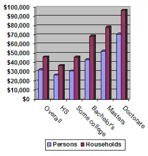 Average earnings in 2002 for the population 18 years and over were higher at each progressively higher level of education ... This relationship holds true not only for the entire population but also across most subgroups. Within each specific educational level, earnings differed by sex and race. This variation may result from a variety of factors, such as occupation, working full- or part-time, age, or labor force experience.[44][48]