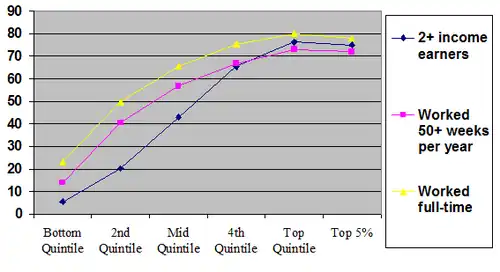 Households in the upper quintiles are generally home to more, better educated and employed working income earners, than those in lower quintiles.[45] Among those in the upper quintile, 62% of householders were college graduates, 80% worked full-time and 76% of households had two or more income earners, compared to the national percentages of 27%, 58% and 42%, respectively.[44][46][47] Upper-most sphere US Census Bureau data indicated that occupational achievement and the possession of scarce skills correlates with higher income.[47]