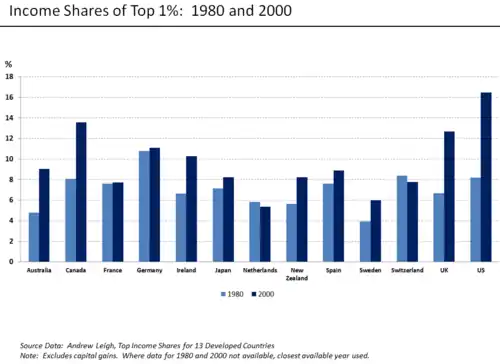 Income inequality in the United States grew significantly beginning in the early 1970s,[2][3][4] after several decades of stability.[5][6][7] The US consistently exhibits higher rates of income inequality than most developed nations, arguably due to the nation's relatively less regulated markets.[8][9][10]