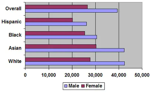Income levels vary by gender and race with median income levels considerably below the national median for females compared to men with certain racial demographics.[62]