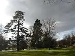 Caversham Court contains a number of fine tree specimens in particular, a large Wellingtonia, a Bhutan Pine (Pinus wallichiana),[6] a cedar of Lebanon, an Atlas cedar and a black mulberry near the main entrance. There are also massive yew hedges surrounding the allotment gardens in the north west of the park and an old layered yew, a feature popular in the seventeenth century, whereby a 'family' was created by layering to create a complete ring of 'offspring'.[5]