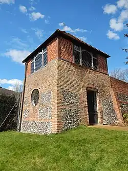 The garden contains a number of Grade II listed buildings and features: the riverside garden pavilion (gazebo), the retaining walls to the raised walk leading to the gazebo, the screen wall along the north east boundary (early to mid 19th century), the retaining walls of axial east–west garden terrace walk (17th century, probably rebuilt in the 18th century), the 17th century stables and the retaining wall of St. Peter's Churchyard and Church of St Peter (a crinkle crankle wall) (18th century). The two-storey gazebo, built by 1663, is one of the oldest remaining examples in the country. It was partially restored in 1979/80.[5]