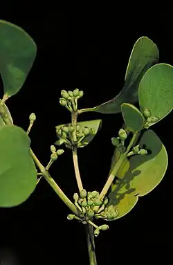 Cecarria obtusifolia is an aerial, stem-parasitic shrub, and like species in the genus Muellerina, it has epicortical runners.[3] It is glabrous throughout.[4] The obovate or broadly obovate[3] leaves are opposite, curvinerved, and rounded at the apex.[3] The leaf blades are 30–55 mm long and 20–45 mm wide, and attenuate into an obscure petiole 2–6 mm long.[5] The inflorescence is axillary, with and a two-flowered umbel or a four-flowered raceme or spike; there are nearly orbicular bracts[5] beneath each flower.[3] The flower has six free petals. The stamens are nearly equal, and the anthers are dorsifixed and versatile,[3] having a short sterile tip with the free part of the filament about 2 mm long.[5]