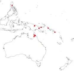 In Australia it occurs in the McIlwraith Range area in Queensland, growing in rainforest. Recorded hosts include plants in the genera: Calophyllum, Casuarina,[7] and Syzygium, and Xanthostemon.[5][7]