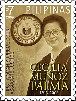 Cecilia Arreglado Muñoz-Palma (November 22, 1913 – January 2, 2006) was a Filipino jurist and the first woman appointed to the Supreme Court of the Philippines.[1] She was appointed to the Supreme Court by President Ferdinand Marcos on October 29, 1973, and served until she reached the then-mandatory retirement age of 65.