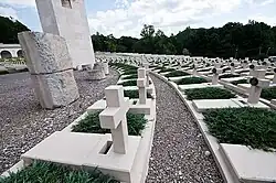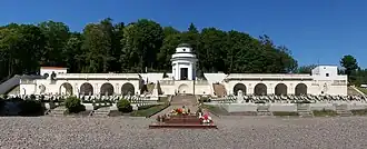 The necropolis complex was designed by Rudolf Indruch, an architecture student from the Lviv Polytechnic whose project won the competition.[3] The most visible element was a domed chapel which towers over the tombs underneath.[3] Exhumed remains of the 72 fighters were put in catacombs located between the chapel and the tombs.[3] In addition to Polish fighters, this part of the cemetery also has graves and monuments to American (pilots from the Kościuszko Squadron) and French volunteers who fought on the Polish side, two monuments were dedicated to those Polish foreign allies.[3] Underneath, an inscription "Mortui sunt ut liberi vivamus" ("They died so we could live free") was engraved on a semi-circular colonnade monument.[3] A triumphal arch was flanked by two stone lions.[3] The necropolis was never finished; its construction continued until the outbreak of the Second World War.[3] Out of almost 3,000 tombs, 300 were dedicated to the Eaglets, as the young Polish defenders of the city from 1918 are known.[3] In 1925 the ashes of one of the unknown defenders of Lwów were transferred to the Tomb of the Unknown Soldier in Warsaw.[4]