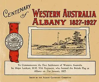 - ^ a b Albany Centenary Committee; W.F. Forster & Co (1927), Centenary of Western Australia : Albany, 1827-1927 : to commemorate the first settlement of Western Australia by Major Lockyer, H.M. 57th Regiment, who hoisted the British flag at Albany on 21st January, 1827, W.F. Forster, retrieved 27 October 2024