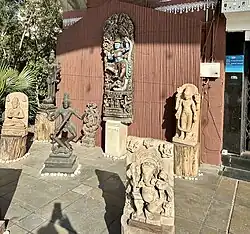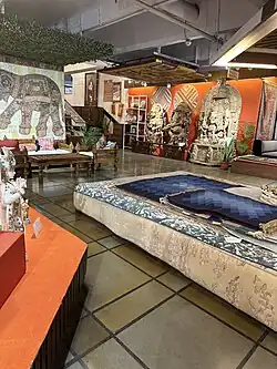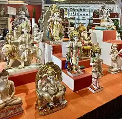 Indian handicrafts sold at the Cottage come from several Indian States.[17] Products include Bankura silver, tea, dress material, clothing, accessories, decorative furnishings, and other gifts.[18][19] Other products include brass ornaments, carved sandalwood figures, pashmina shawls, Kanjeevaram silks, and paintings.[11] Traditionally made from clay, the Bankura horse can be found in the Cottage in brass.[1] As of 2025, the Cottage works with over 5,800 arts and crafts producers, aims to preserve declining arts and craft forms, and provides support to craftspersons.[11]