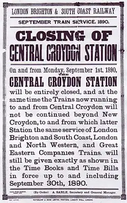 Opened on 1 January 1868,[3] the station was served from platforms 1 and 2 of New Croydon, an extension of East Croydon dealing with local traffic. Initially there were 12 trains per day, to and from London Bridge, but the commercial judgement that had created the station went unrewarded and services ceased after three years, on 1 December 1871.[3] The station was mothballed until 1 June 1886[3] when, under pressure from the council, it was reopened. Around this time, the LBSCR sought to improve the usefulness of the branch by extending it under High Street to curve around to the right to join the West Croydon - Epsom line at West Croydon, but this plan, which might have seen it become a viable station, was not realised.[1]