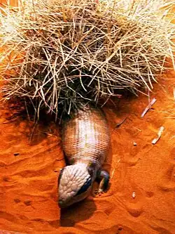 The geographical distribution of the blue-tongued skink lies throughout the far north-west corner of New South Wales and South Australia, and centrally throughout Western Australia, the Northern Territory and Queensland.[5][6] In general, habitats include a variety of arid and semi-arid stony and red sandy spinifex vegetated areas.[6]