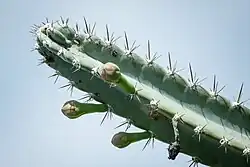 Cereus horrispinus is a species of Cereus native to Colombia and Venezuela; This plant grows in the seasonally dry tropical areas.[1] It is semi-decumbent cactus can grow up to 5 meters tall with bluish-green stems. These stems grow up to 1 meter tall, and 5cm inches in diameter. The areoles of this species bear grey spines. From the areoles, sweet-scented nocturnal flowers emerge. Its flowers grow up to 17cm, its greenish fruits are spherical to egg-shaped, revealing their edible flesh. [2]