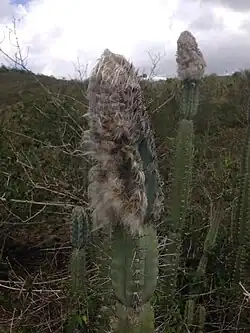 This plant is sometimes placed in the genus Pilosocereus because of its cephalium.