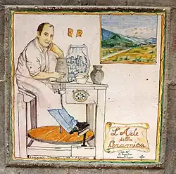 In the "new" Cerreto, there was a true ceramists’ quarter located near the Cerreto Sannita Cathedral. During the renovation of several buildings in that area, remains of kilns for firing terracotta and ceramics were found.[7] In this "ceramists’ insula," there were the workshops of Francesco Iadomaso, a Cerreto native, and Carlo Coluccio from Campobasso. In the same area was the workshop of Nicolò Russo, a master faenzaro who moved from Naples in 1693. Many young apprentices worked in his workshop, becoming the main figures of Cerreto ceramics in the 18th century: Domenico Marchitto, Santi Festa, Melchiorre Cerri, Nicola and Crescenzo Petruccio, Nicola Marchitto, Salvatore Paduano, and Giuseppe Paolino. Russo created numerous works in Cerreto Sannita, including several floorings in religious buildings.[5]