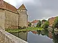 The enceinte originally comprised eight towers and two gateways. Wanting a more panoramic view, Mansart demolished the curtain walls on the east and created gardens. The west and north sides of the enceinte still exist. Also still visible are the pillars supporting the base of the bartizans (watch towers), parts of the portcullis in its housing and door panels from the 16th century. Under the Gothic arch vault can be seen the start of the staircase leading to the upper floors. Four towers remain. The facade looking onto the courtyard dates from the 15th century and has moulded windows as well as the openings made in the 18th century at the end of the building. Most of the doors still have their original decorative moulding. All of the buildings were covered with plafonds à la française (French-style ceilings: joists the same width as the spaces between them; see Plafond à la française in French Wikipedia).[1]