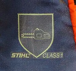 In the EU, chainsaw trousers, boots, and gloves (the items containing chainsaw protective fabric) must carry a special chainsaw logo.[2] This shows that the fabric has been tested to protect properly, and also shows the class of protection.
