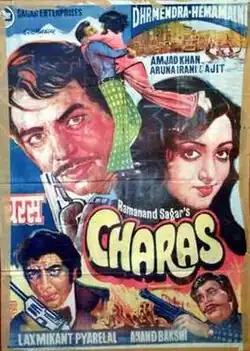 Charas (transl. Hashish) is a 1976 Indian Hindi-language action thriller film produced and directed by Ramanand Sagar.[2] It is set against the backdrop of the expulsion of Indian community from Uganda by its dictator Idi Amin in 1972. The film stars Dharmendra, Hema Malini, Ajit, Amjad Khan, Sujit Kumar, Aruna Irani, Asrani, Keshto Mukherjee and Tom Alter in lead roles.[3] The film's music is by Laxmikant–Pyarelal.[4]