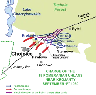 The charge at Krojanty, battle of Krojanty,[1] the riding of Krojanty or skirmish of Krojanty[2] was a Polish cavalry charge on the evening of 1 September 1939, the first day of the Second World War, near the Pomeranian village of Krojanty. It occurred at the start of the invasion of Poland and was part of the larger Battle of Tuchola Forest. Polish soldiers advanced east along the railway to a railroad crossroads 7 kilometres (4.3 mi) from the town of Chojnice, where elements of the Polish cavalry charged and dispersed a German infantry battalion. Machine gun fire from German armoured cars that appeared from a nearby forest forced the Poles to retreat. However, the attack delayed the German advance, allowing the Polish 1st Rifle Battalion and Czersk Operational Group to withdraw safely.