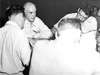 McVay talks to war correspondents in Guam about the sinking of his ship in August 1945