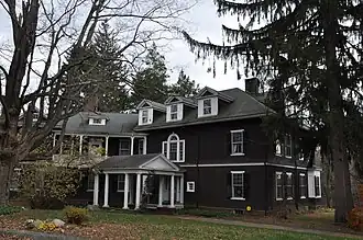 The Charles D. Lewis House is a historic house in Sherborn, Massachusetts. It is a two-story wood-frame structure, set on a brick and rubblestone foundation, and exhibits informal Shingle style massing with elements of formal Colonial Revival detail. The house is built in a wide V-shape opening to the north, its main entrance south-facing with porches, but, within the angled facades to the north, a circular driveway and port-cochere entry, supported by Tuscan columns. It was built as a gentleman's farm and one of the town's earliest summer residences circa 1905, by Charles D. Lewis, a businessman whose family owned Lewis Wharf in Boston.[2]