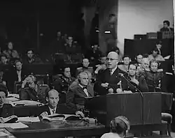 Dubost was a member of the French delegation to the Nuremberg trials in 1946.[1] For example, he asked a witness if the Germans had known about the concentration camps.[3] He also presented some documents which showed that Hermann Göring had purposely built camps for British prisoners near RAF targets.[4][5] Moreover, he began research for the prosecution of German businessmen, although the trial was subsequently conducted by United States judges instead.[1]