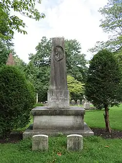 Evans' remains were returned to Reading that same evening (September 6, 1847), and he was interred three days later at the cemetery that he had founded and which still bears his name.[41] At Evans' direction, the remains of his widow, Mary, were subsequently exhumed from the Episcopal Church graveyard and reinterred beside his by Jacob Gnau, the longtime sexton at Charles Evans Cemetery. Gnau also attempted to locate and move the remains of the Evans' children, but was unable to locate them due to their advanced state of decay.[42]