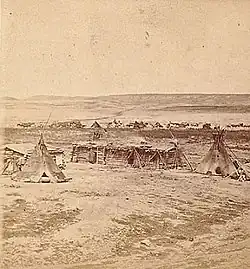 In 1860, Larpenteur became partner in an independent fur trading venture, Larpenteur, Smith & Company. The outfit went west over St. Paul and Pembina, and Larpenteur erected a trading post at Poplar River. Back in St. Louis in 1861, the company was reorganized as Larpenteur, Lemon & Company, due to dissension among the original partners. The same year, 1862, Larpenteur became a fur trader with a new company, La Barge, Harkness & Company.[6][7] In 1864 Larpenteur was back at Fort Union, now as Bourgeois or manager. Within a short time, however, the fort was sold the new Northwestern Fur Company, and Larpenteur resigned. In 1866 he served as an Assiniboine interpreter for the Indian Peace Commission, and the following year he became a fur trader for Durfee & Peck, but was fired after a conflict.[8] In 1869, Larpenteur brought his family from Iowa to Fort Buford, where he established a trading post. New regulations in 1870 limited the number of traders to one approved sutler per military post, and Larpenteur applied to the secretary of war, William W. Belknap for approval. This was, however, refused, and Larpenteur returned with his family to Iowa, where he died in 1872.[9]