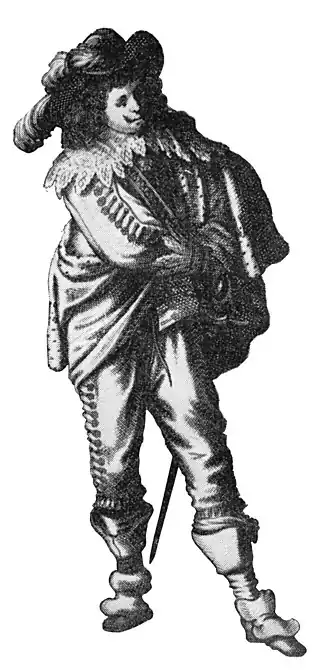Charles Le Noir, c. 1635, detail from an engraving by Abraham Bosse, depicting the Troupe Royale at the Hôtel de Bourgogne in Paris[1]