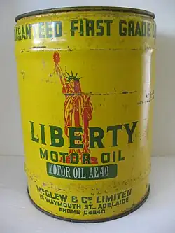 LIBERTY brand motor oil can, 4 gallon (20 litre), vintage c. 1931, McGlew & Co Ltd, Adelaide S.A.