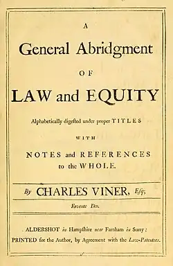 • Viner, C. A General Abridgment of Law and Equity, Alphabetically Digested under proper Titles; with Notes and References to the Whole. 23 vols. fol. Aldershot. 1742 - 53. 2d ed. 24 vols. 8vo. London. 1791 - 94.