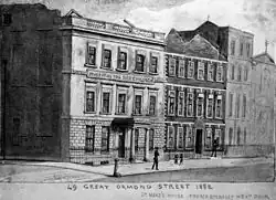 After some unfortunate attempts to transform the Waterloo Dispensary for children into a hospital, he decided to start a fundraising campaign in order to establish in London a hospital specifically for children. Also due to his remarkable oratorical gifts, West's campaign had success and, in the spring of 1851, a little hospital with ten beds was opened at 49 Great Ormond Street, in a house that had belonged to Richard Mead.[7] In 1854, after three years of activity, Charles West - who was the first physician of the hospital - could describe the initial success of the structure. He also took advantage from this success to boost research funds in view of further enlargement: