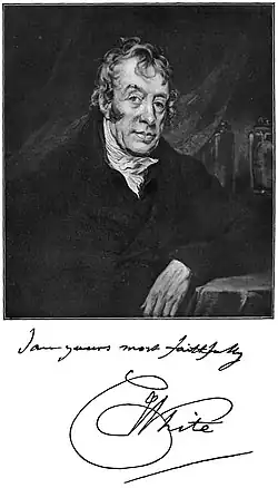 In 1757, White married Ann Bradshaw, whose father had been a high sheriff for the county of Lancaster. They had eight children, four sons and four daughters. Two of his sons had become doctors, but they and his two other sons died before him. In 1803, White suffered an attack of ophthalmia, which initially only affected his left eye, and — with difficulty — he continued to work. In 1811, it affected the right eye and he soon became blind. He died at his home in Sale on 20 February 1813.[1] He was survived by his daughters, one of whom, Anne White, married Sir Richard Clayton, to whom White's thesis on Regular Gradation of man was dedicated.