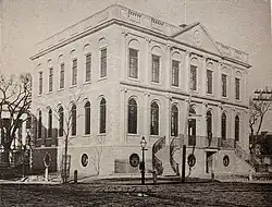 The site of City Hall was a beef market in 1739, but the market was destroyed in a fire in 1796, and the corner parcel was conveyed to the Charleston branch of the First Bank of the United States in 1800.[2] The construction of the bank was overseen by Edward Magrath and Joseph Nicholsen (carpenters) and by Andrew Gordon (mason).[2]