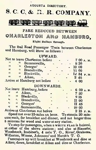 The South Carolina Canal and Rail Road Company was a railroad in South Carolina that operated independently from 1830 to 1844. One of the first railroads in North America to be chartered and constructed, it provided the first steam-powered, scheduled passenger train service in the United States.[1]