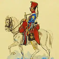 Léonce Bernardin wrote of the regiment's trumpeters in 1815 that they "wore crimson pelisse, sky-blue pants and side caps".[25] This uniform, reproduced by Ernest Fort, details a garance shako with green and yellow pompom and cord, a crimson pelisse with yellow braids and braids edged with black fur, and sky-blue pants with a double garance stripe.[10] The trumpeter in full regalia from the Alsatian collections wears a madder shako topped with a white pompom, as well as a sky-blue dolman with green collar and white braids. The pelisse is identical to the dolman, the belt is green and madder and the pants madder with orange Hungarian knots.[26] However, Commandant Bucquoy notes that he has "little confidence in his accuracy. The green collar of the dolman and the blue pelisse seem impossible to me".[27]