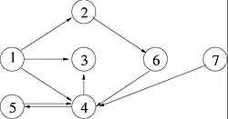 A simple example of the construction of the Google matrices and , used for determination of the related PageRank and CheiRank vectors, is given below. The directed network example with 7 nodes is shown in Fig.4. The matrix , built with the rules described in the article Google matrix, is shown in Fig.5; the related Google matrix is and the PageRank vector is the right eigenvector of with the unit eigenvalue (). In a similar way, to determine the CheiRank eigenvector all directions of links in Fig.4 are inverted, then the matrix is built, according to the same rules applied for the network with inverted link directions, as shown in Fig.6. The related Google matrix is and the CheiRank vector is the right eigenvector of with the unit eigenvalue (). Here is the damping factor taken at its usual value.
