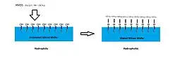 A common method to increase adhesion of photoresist on the silicon wafer surface is to treat the wafer with Hexamethyldisilazane (HMDS). A new silicon wafer has a polar surface and has some adsorbed water on the surface.[10] The wafer can undergo a dehydration bake to remove adsorbed water, and followed by the HMDS treatment also known as the priming stage. HMDS can be dispensed in liquid form onto the wafer using a syringe while the wafer is attached to a vacuum chuck in a spin coater. HMDS can also be applied in gas form in the process known as the vapor prime. The HMDS promotes good photoresist-to-wafer adhesion because it ensures the wafer surface is hydrophobic. After HMDS treatment the silicon surface oxide becomes silated, leaving a non-polar surface.[11] The pristine silicon (100) face has a surface energy value of 56.9 mN/m, which is reduced to a value of 44.1 mN/m after HMDS treatment[12] The molecular formula for hexamethyldisilazane is C6H19NSi2.