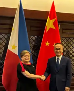 In 2024, Chen and Philippine Department of Foreign Affairs (DFA) Undersecretary Ma. Theresa Lazaro had a phone call regarding the South China Sea issue.[6] In January 2025, a bilateral meeting in Xiamen, China was held, led by Chen and Lazaro. Although the DFA agreed to deescalate tensions with China, Lazaro raised concerns over incidents involving the Chinese Coast Guard's presence in the South China Sea.[7][8] Chen warned the Philippines to act cautiously as both China and Philippine relations were at a crossroads.[6]
