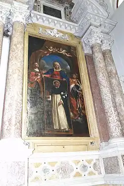 At the end of the apse is The Vision of Soriano, an altarpiece by Guercino (1655) showing a vision by Lorenzo da Grotteria, a Dominican lay brother in the monastery at Soriano Calabro on the night of 15 September 1530, in which he saw the Virgin Mary, Mary Magdalene and Catherine of Alexandria, who at the end of the vision left in his hands a painting of his order's founder Saint Dominic holding a book and a lily, respectively symbolising the learning and purity of the order's members. With three surviving preparatory sketches for it (two in the National Gallery of Ireland and the third in a private collection in Stuttgart), Guercino's painting was commissioned by the town's Mercantile Magistrate via consul Bernardino Borno of Verona and put in place a year later. It was taken to the parish church when the monastery was suppressed in 1785, but was returned to the Dominicans' former monastery church in 1970.
