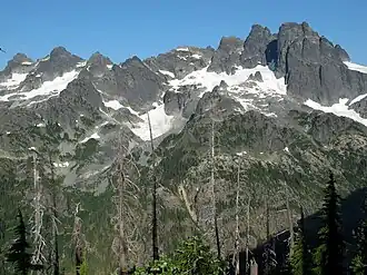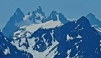 Chimney Rock is a mountain located in the Alpine Lakes Wilderness of the Central Cascade Range in western Washington, United States. The mountain has two main summits, a northeast spire ("north peak") (7,634 feet (2,327 m)) and a central spire (7,727 feet (2,355 m)), as well as a minor south peak (7,440 feet (2,270 m)). Situated 10 miles NNE of Snoqualmie Pass, with its craggy appearance Chimney Rock is the most distinctive peak on the crest dividing the Snoqualmie River and Yakima River drainage areas. Lemah Mountain (7,480 feet (2,280 m)) is to the south on the crest, and Summit Chief Mountain (7,464 feet (2,275 m)) to the northeast. Overcoat Peak (7,432 feet (2,265 m)) is off the main ridge just to the north of Chimney Rock. The mountain has three glaciers: the Overcoat Glacier on the north, the Chimney Glacier on the south and east, and an unnamed glacier on the east side of the North Peak.[3]