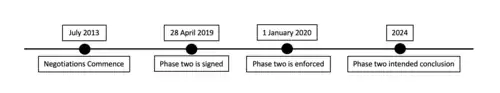 The CPFTA has two phases. The initial phase was signed on 24 November 2006, and concluded in December 2012.[6] The second phase was signed on 28 April 2019, and came into force on 1 January 2020.[7] Phase two will conclude in 2024.[8]